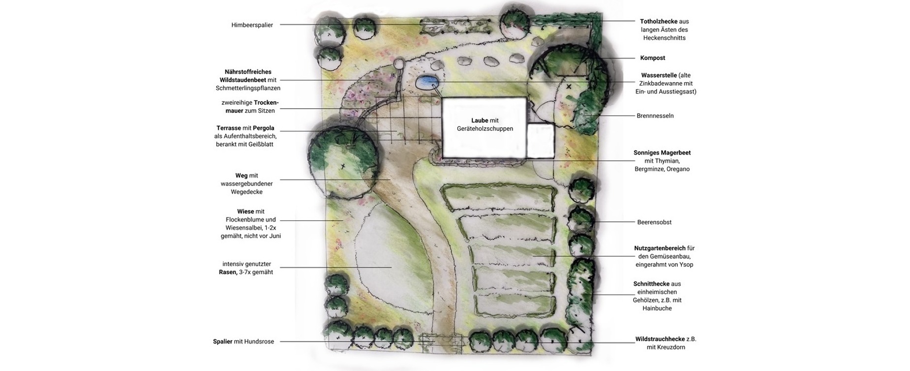 Gestaltungsidee für einen schmetterlingsfreundlichen Kleingarten. Grafik: ©DAUCUM gUG/Wanda Born